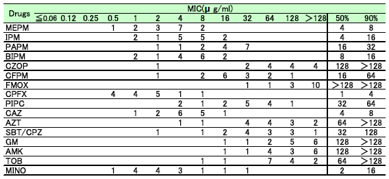 Pseudomonas aeruginosa 322株に対する各薬剤のMIC分布、MIC50、MIC90